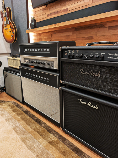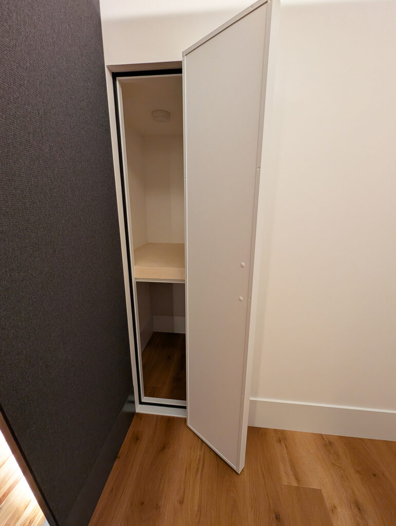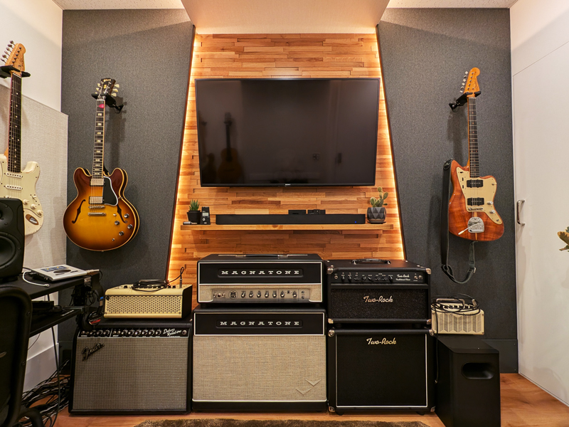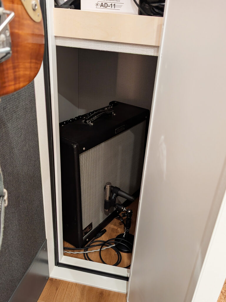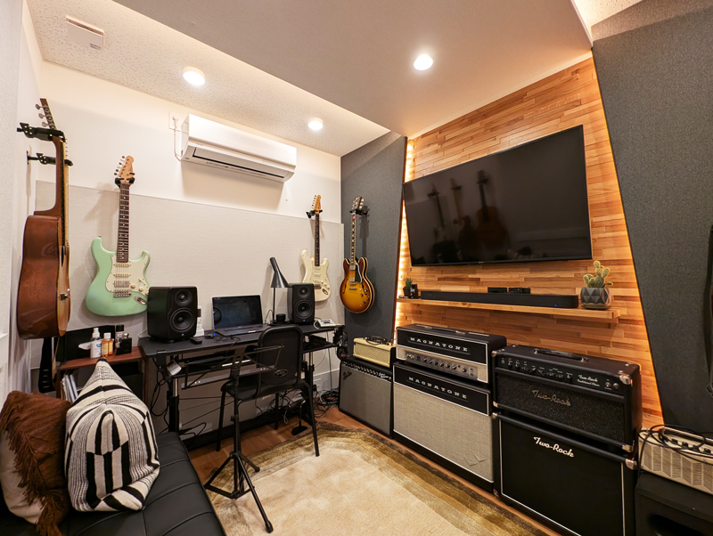 ギターアンプのサイズや配置動線を詳細にリサーチし、クローゼットをアンプブースとして再構築。レッスン・リハ・撮影の用途を無理なく両立させています。