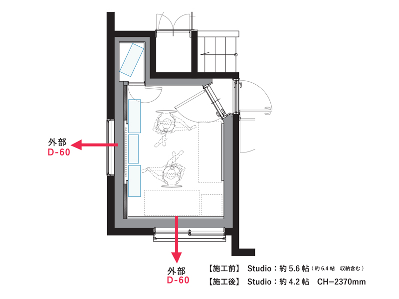 当初は道路側の部屋で検討されていましたが、道路騒音がスタジオ内へ影響する可能性を考慮し、別室への変更をご提案。外部に対して D-60を確保したことで、外部騒音の流入と音漏れを抑制し、演奏や録音に適した音環境を実現しました。