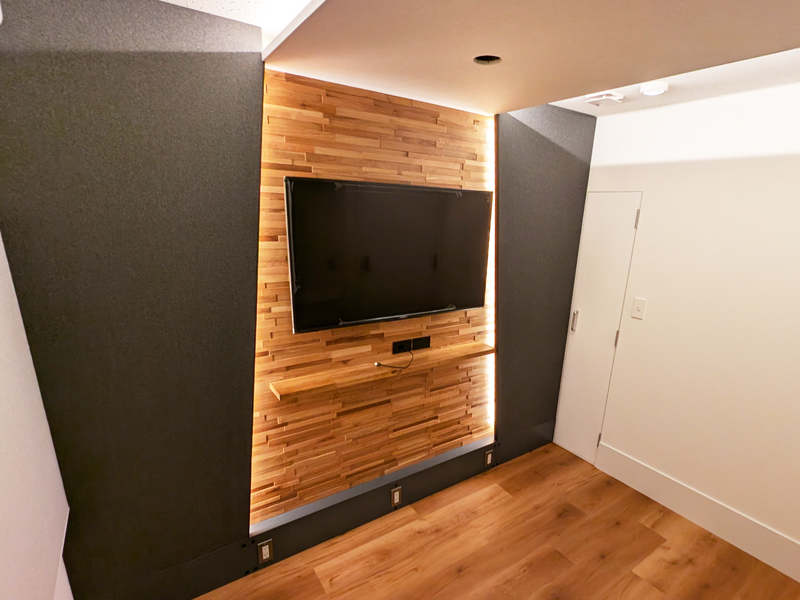 アクセントウォールにウッドタイルを配置。テープライトの調光により撮影演出が可能になり、YouTube収録や写真撮影にも最適な空間となりました。