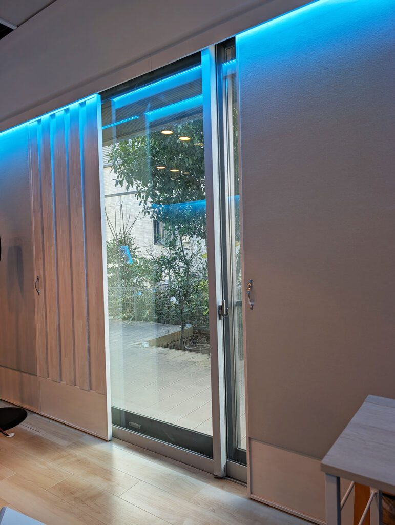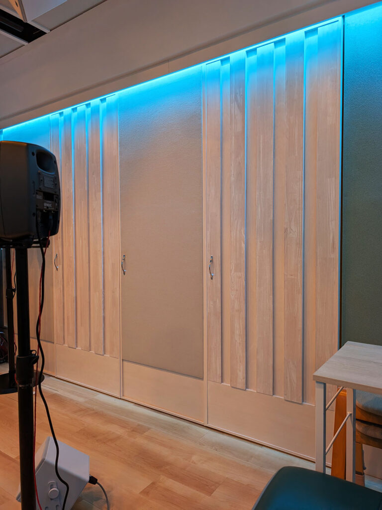 カラーリングは、既存スタジオのブルーグリーンを基調に、ホワイトウッドと間接照明を組み合わせ、落ち着きと上質さを兼ね備えた空間に仕上げています。